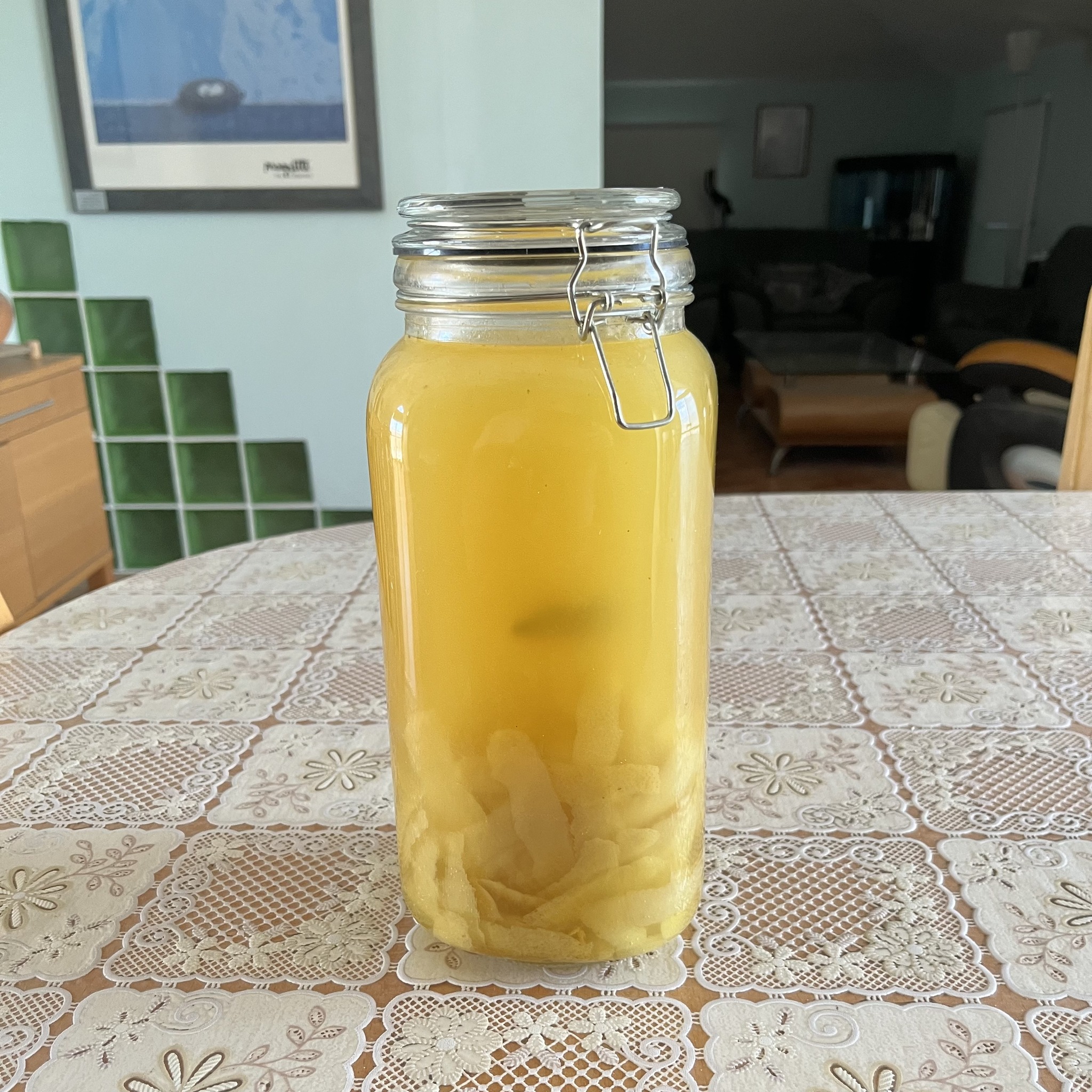 1. ערבוב מדי כמה ימים של קליפות הלימון המגורדות בצורה עדינה מאד רק בחלק הצהוב של הקליפה - החל מתחילת ההכנה ב 24.12.2025 , עם אלכוהול מאושר לשתיה 95% ומ 2.02.2026 בה הוספה תמיסת הסוכר להגעה לריכוז סופי של 40% אלכוהול במשקה.